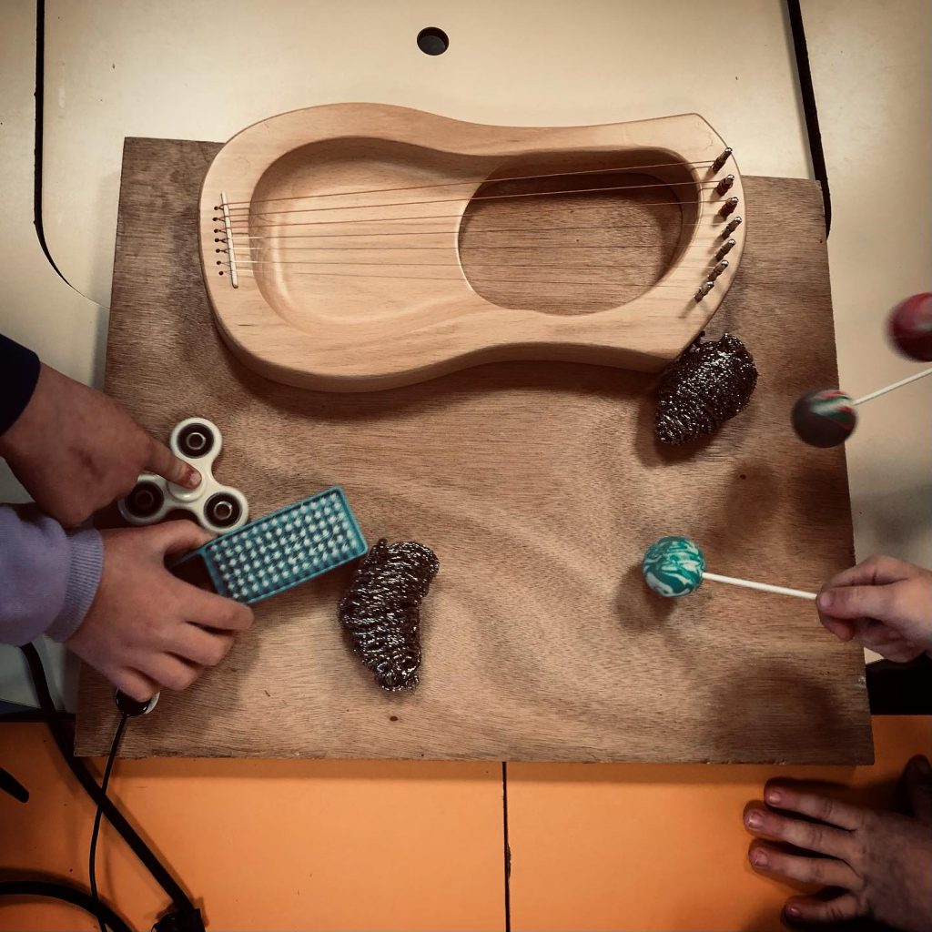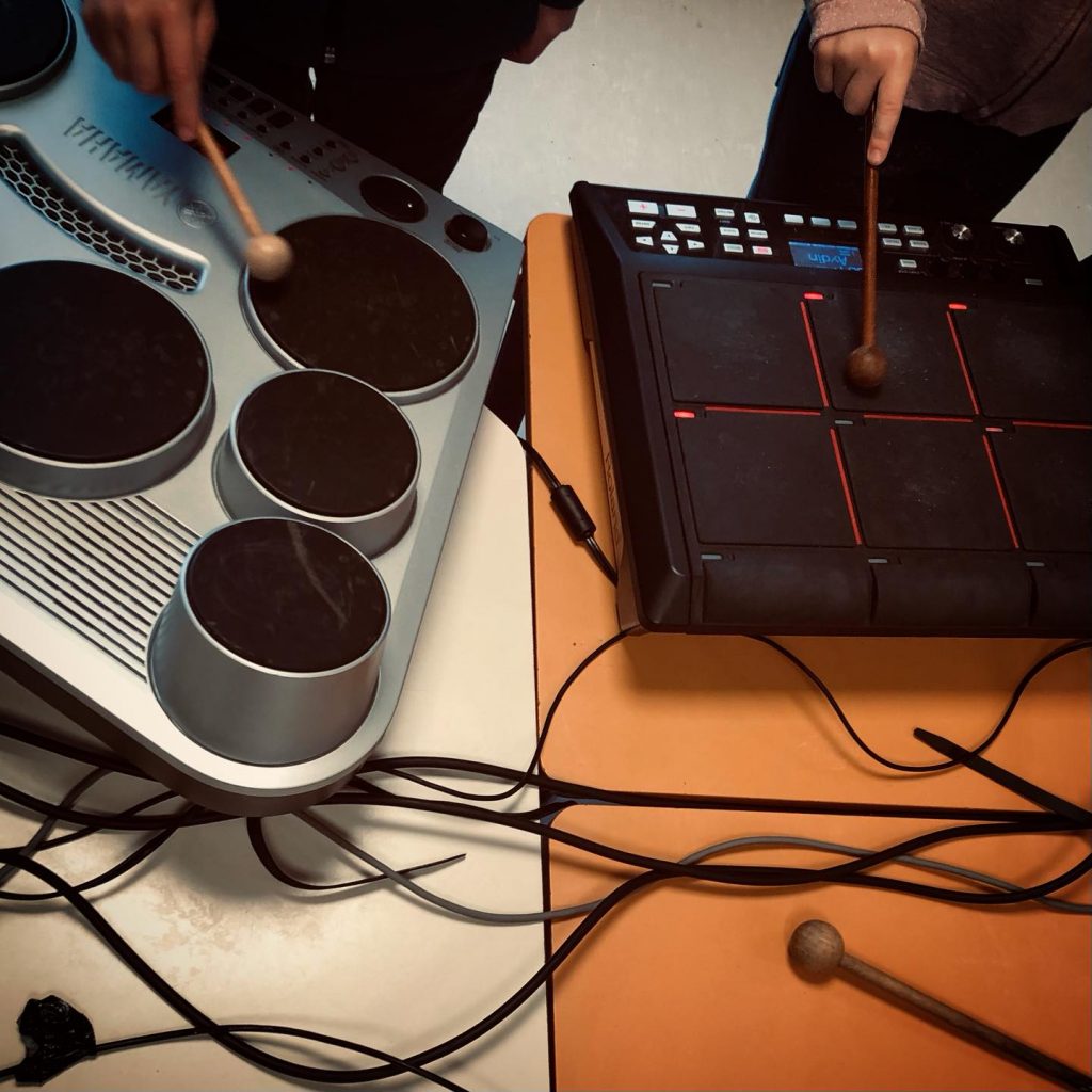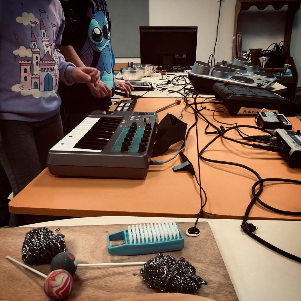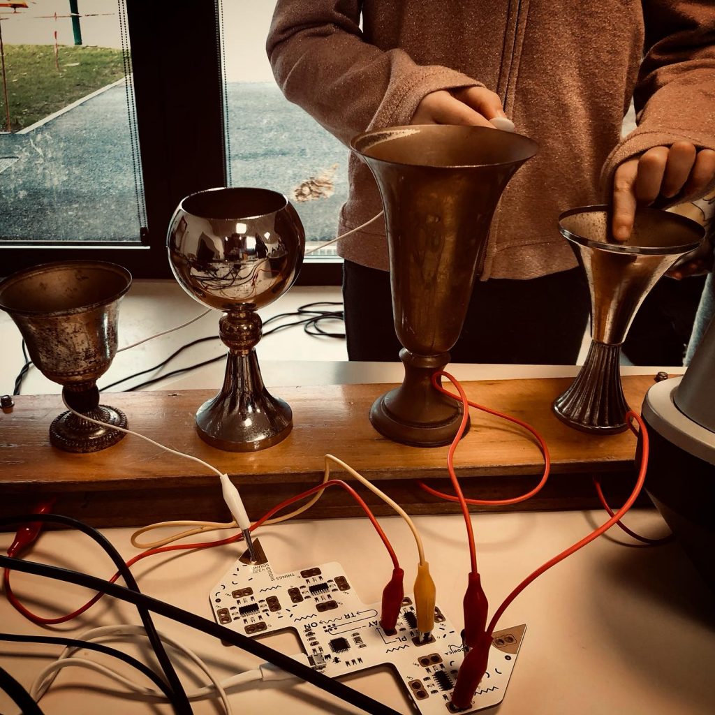 En atelier le public utilise des objets sonores, des instruments, des objets électroniques, des appareils midi relié à l’ordinateur.